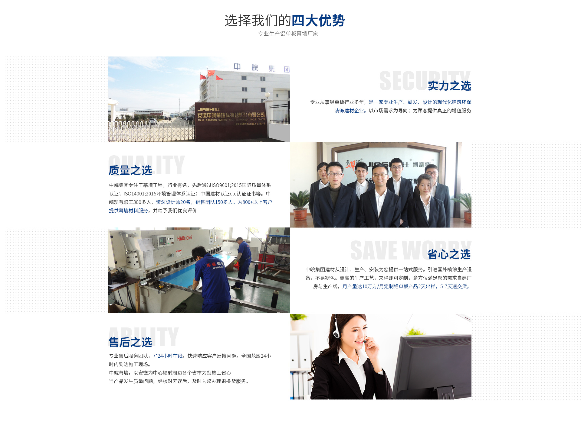 安徽中皖幕墻科技(集團)有限公司 安徽中皖集團是一家幕墻鋁單板生產、研發、設計、銷售一體化的現代化建筑環保裝飾建材企業。 旗下控股公司: 安徽嘉士新型材料有限公司 安徽博利泰幕墻有限公司 安徽泰鋁裝飾建材有限公司 中皖旗下品牌通過ISO9001;2015國際質量體系認證和ISO14001;2015環境管理體系認證,中國建材認證ctc認證的專業認證書。并榮獲重合同守信用企業;認證證書;重質量守信用企...